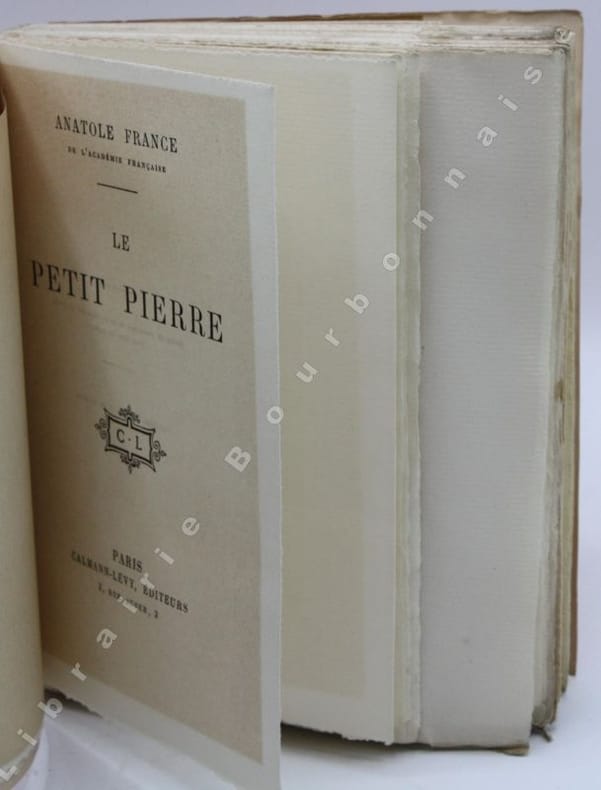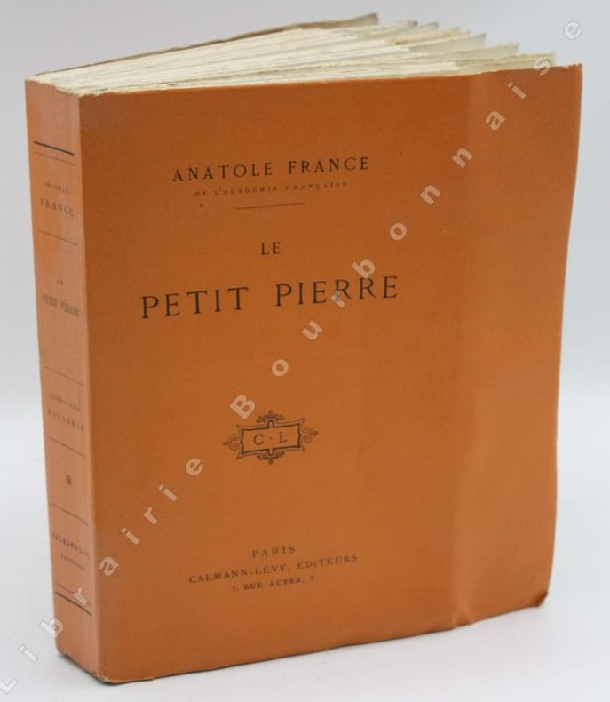 Anatole France est déjà âgé de 74 ans quand il livre avec précisions et un ton de confidence dans Le Petit Pierre (1918) ce qu'il a déjà auparavant évoqué dans Le Livre de mon ami (1885), puis dans Pierre Nozière (1899). Au contraire des deux premiers Le Petit Pierre se présente beaucoup plus riche en notations qui révèlent le caractère de l'auteur. « France nous y apprend que son esprit s'est modelé sur celui de son père, traditionaliste, spiritualiste et même chrétien, mais 'comme une coupe moulée sur le sein d'une amante' ! C'est-à-dire qu'il en reproduisit en creux les plus suaves rondeurs. Façon bizarrement poétique poétique d'exprimer qu'il prit en toutes choses contre-pied des opinions [...] de son éducateur ! ». Jolie provenance pour cet ensemble de souvenirs conservé dans une chemise-étui au nom de Paul Souday. Critique littéraire, ami de l'auteur, Souday est entre autre célèbre suite à la polémique qui l'opposa à Marcel Proust auquel il reprocha dans une tribune du Temps (10 décembre 1913) les «fautes de français» dans Du côté de chez Swann... L'histoire dit que l'auteur de la Recherche lui pardonna, qu'ils devinrent même amis et que ce qui les avaient fâchés devint un sujet de plaisanterie. Des bibliothèques Paul Souday puis Lucien Graux (ex-libris).