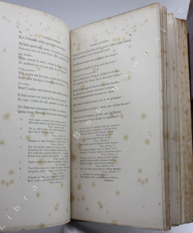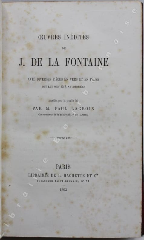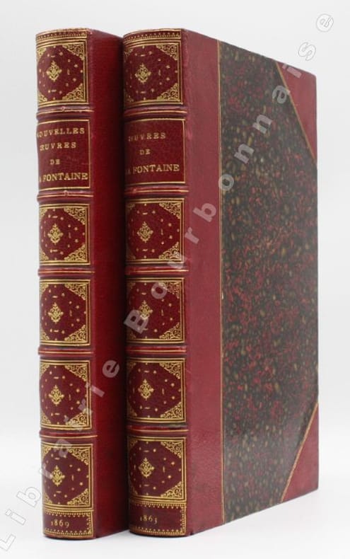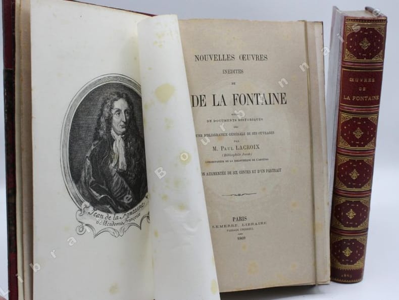 Le premier volume est en édition originale ; le célèbre bibliophile Paul Lacroix, Conservateur de la Bibliothèque de l'Arsenal, restitue à La Fontaine 27 fables, 5 contes ainsi qu'une soixantaine de pièces diverses et de poésies (épître, lettres, chansons...). Le second volume vient compléter le premier, il s'agit des derniers exemplaires de l'édition imprimée en 1868 à très petit nombre, auxquels on a joint en fin de volume six nouveaux contes et en frontispice le portrait gravé de La Fontaine (d'après Hyacinthe Rigaud). Ces nouveaux contes s'intitulent "Le poète", "On ne se souvient pas de tout ce qu'on promet", "Le Plaideur", "Le Cadet de Gascogne", "L'Hôtesse", "La cheville", précédés d'une préface donnant l'origine de la découverte de ceux-ci.Chacun de ces volumes est peu courant et la réunion des deux l'est encore moins. (Rochambeau, Bibliographie de La Fontaine, Pièces diverses, p. 630 n° 84 et 86).
