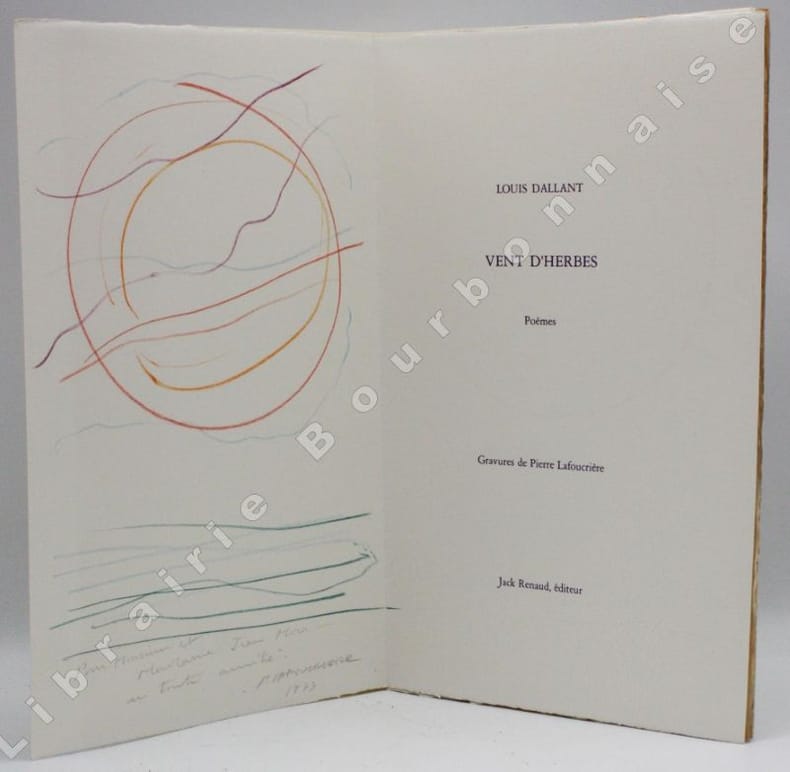 Edition originale tirée à 200 exemplaires sur papier vélin "fait à la main", ornée de 2 gravures originales signée de l'artiste, et enrichie d'un dessin original aux crayons de couleurs avec une dédicace de P. Lafoucrière.Le poète et le peintre étaient tous les deux attachés à la région de Montluçon. Lafoucrière, né à Louroux-de-Bouble en 1927 a exposé dans le monde entier, ses oeuvres sont présentent dans de nombreux musées et il a illustré plusieurs recueils de poésies (J.-M. Barnaud, A. Borne, L. Dallant, H. Kréa, J.F. Manier°. Il est décédé en 2017. Louis Dallant, originaire de Guérêt, était avocat à Montluçon ; amoureux de sa région, des livres (il affectionnait particulièrement condisciple Jouhandeau) et de peinture contemporaine, il est l'auteur de plusieurs publications poétiques dont deux au moins ont été illustrées par Lafoucrière. Il est décédé en 2007.