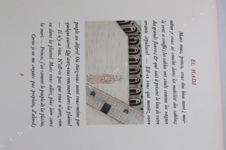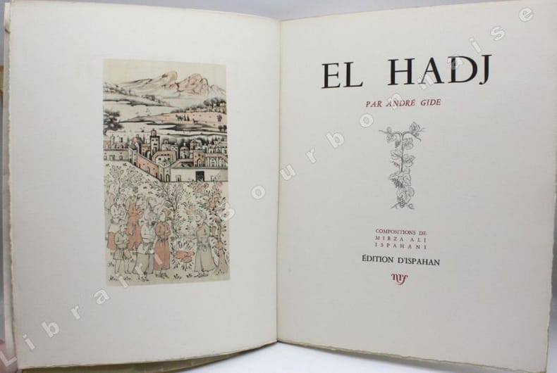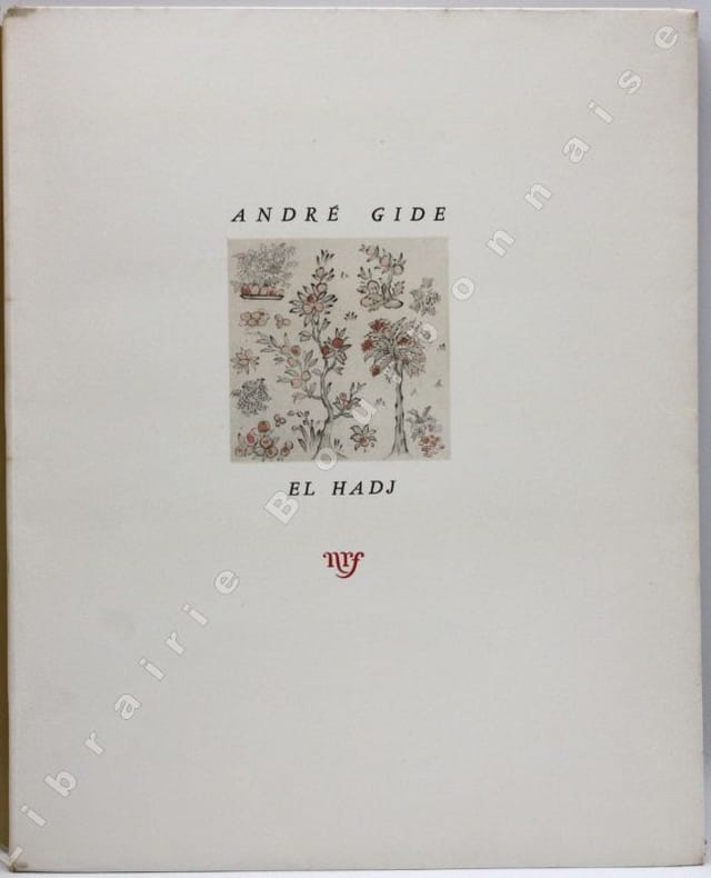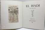 Edition tirée à 1128 exemplaires, un des 1060 sur vélin d'Arches, illustrée de 18 compositions coloriées par Beaufumé. Cette fiction s'inscrit dans le décor du troisième voyage en Algérie de Gide (1886). "Mené par le doute et par le besoin impérieux d'être et de comprendre, Gide est pris au piège d'une littérature à laquelle il ne peut pas se dérober, alors qu'elle le place sans cesse devant soi-même, devant une sincérité impossible. Cette problématique intime de la conscience gidienne ainsi établie pose la question fondamentale du bonheur et de ses moyens d'accès: se libère-t-on jamais totalement des orientations données dans l'enfance ?". (Pierre LACHASSE, "El Hadj ou la démystification". Bulletin des Amis d'André Gide. Juillet 1986). El Hadj avait été publié la première fois dans la revue Le Centaure en 1896.