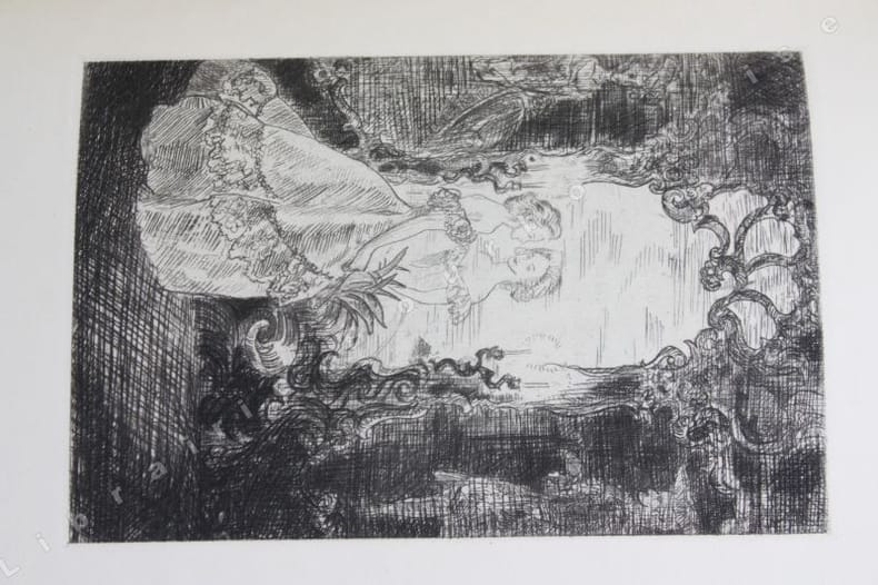 Emile-Paul 1943 Petit in-4 broché, couverture gaufrée & illustrée rempliée,, emboîtage terni, 208 pp. 15 eaux fortes originales hors texte sous serpente. Un mors lég. fendillé en pied. Bon exemplaire.
