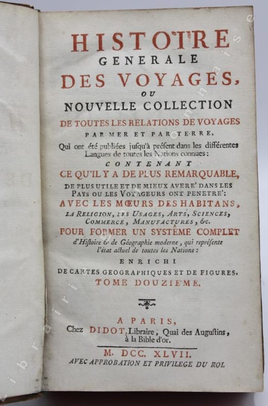 Paris, Didot, 1747 ; 1 vol. in-12. 2 ff.-508 pp. - 3 cartes dépliantes. Veau brin, dos à nerfs orné, pièce de titre rouge. Charnière du second plat fendue avec manque, coiffe inf. arrachée. Intérieur très frais.