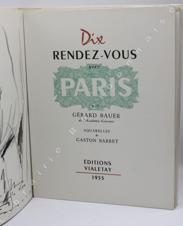 Un des exemplaires numérotés à la presse sur papier vélin blanc (819/1250). Édition originale (le texte seul fut repris dans une petite édition de 1959).Descendant naturel d'Alexandre Dumas par l'une de ses maîtresses, Gérard Bauër (1888-1967) fut un essayiste à la plume facile, et aux curiosités multiples. Les compositions en couleurs représentent :1. Rue Duchefdelaville [XIIIe arrondissement]. - 2. Place Lucien-Herr [Ve]. - 3. Quai d'Orléans [IVe]. - 4. Hôtel de Sens [IVe]. - 5. Place d'Aligre [XIIe]. - 6. Canal Saint-Martin [Xe et XIe]. - 7. Impasse Piat à Ménilmontant [XXe]. - 8. Église Saint-Germain-de-Charonne [XXe]. - 9. Place du Tertre [XVIIIe]. - 10. Rue Berton [XVIe]. - - VENTE PAR CORRESPONDANCE UNIQUEMENT
