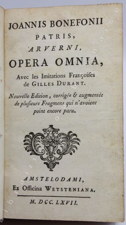 Jean Bonnefons est né à Clermont en 1554 dans une famille de juristes. Il fit lui-même des études de droit à Bourges et c'est là qu'il se lia d'amitié avec son compatriote Gilles Durant de La Bergerie, également clermontois, et collaborateur de la Satire Ménippée. Cette édition réunit l'oeuvre principale de Bonnefons : "Les baisers", ou "La Pancaris", en latin, avec son "imitation en français" par Gilles Durant de La Bergerie, suivies d'autres "Gayetez amoureuses, de l'invention de l'auteur" (Durant). Les Préfaces "pour servir aux ouvrages" des auteurs sont attribuées à Bernard de La Monnoye. (Brunet I, 1096).