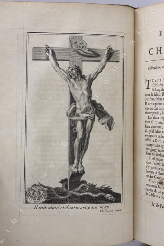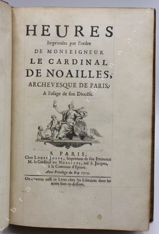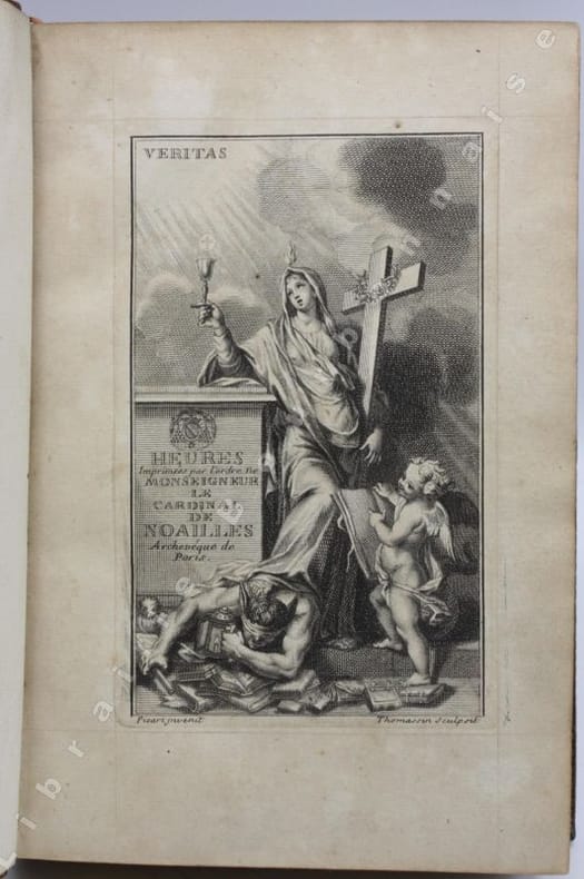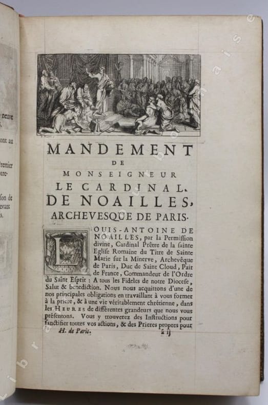 Titre allégorique gravé en taille douce par Thomassin d'après Bernard Picard, de même que la Crucifixion, la Résurrection, l'Annonciation et le Roi David, hors-texte et la vignette de titre et le bandeau en-tête du Mandement. Armes du cardinal gravées sur bois en culs-de-lampe. Texte réglé, grandes marges. Belle édition partagée entre plusieurs libraires dont les noms sont donnés au verso du titre : Pierre Herissant, Claude de Hansy, François H. Muget et Esprit Billiot. On oublie parfois de Louis-Antoine de Noailles est né en Auvergne, au château de Peynières à Cros-de-Montvert dans le Cantal, en 1651. Il fut évêque de Cahors, puis de Châlon-en-Champagne avant d'être nommé archevêque de Paris en 1695.