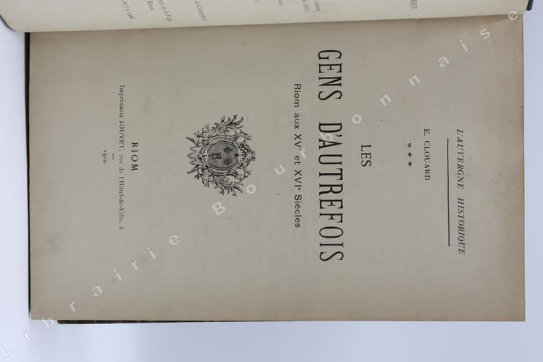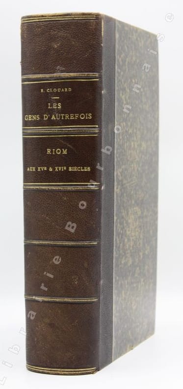 Edition originale. Comme souvent dans cet ouvrage il manque ici 3 planches (Jean de Berry - Bataille de Cognat - Frise des quatre vertus) qui n'ont jamais été reliées. Préface par Charles Le Goffic. Clouard était fonctionnaire de l'Enregistrement et après sa mutation à Riom se passionna pour l'histoire de cette ville. Il dépouilla les archives publiques, les minutes notariales, les registres du chapitre de Saint-Amable, ceux des Consuls... et en tira ce gros volume. Il s'attache à l'étude de la charte de franchise accordée à la ville par Alphonse de Poitiers en 1287 ; il retrace l'évolution des fortifications à travers les décisions municipales et scrute l'organisation administrative de Riom et ses conséquences sur la vie des habitants.