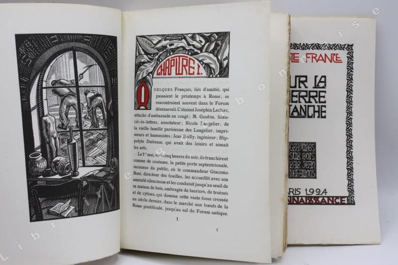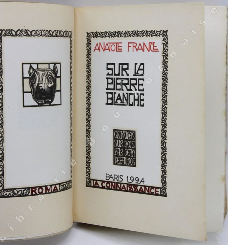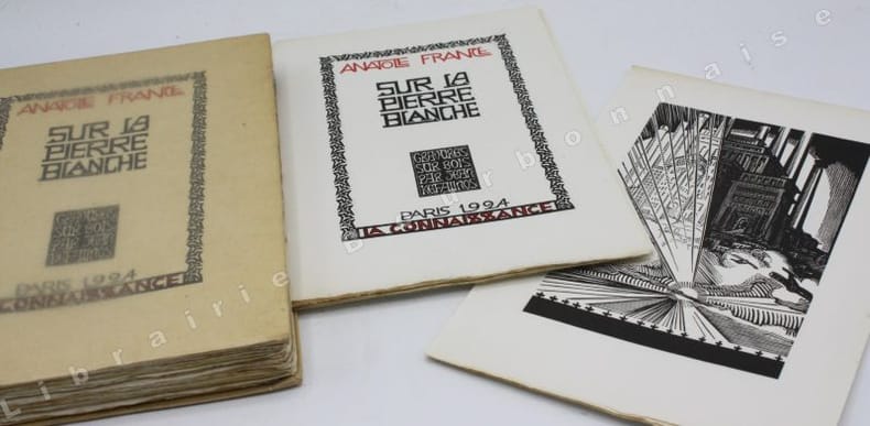 Édition tirée à 1130 exemplaires, un des 1000 numérotés sur Vélin de Rives à la forme avec une suite des illustrations dessinées et gravées par Jean Kefallinos. Ce dernier est un artiste grec originaire d'Athènes (1894-1957), installé à Paris après la Première guerre mondiale il s'adonne à la gravure et orne de ses oeuvres un premier livre en 1922 : "Mer Océane" de Joseph Rivière (Paris, Edition de soy mesme), puis en 1924 cet ouvrage d'Anatole France. A son retour en Grèce en 1930 il intègre l'Ecole des beaux-arts d'Athènes où il enseigne la gravure et la lithographie. Pendant la Seconde guerre mondiale il publie des affiches pour la résistance grecque ce qui lui valut d'être arrêté par l'occupant italien. "Sur la pierre blanche" avait paru en articles dans l'Humanité en 1904, et en volume chez Calmann-Lévy en 1905.