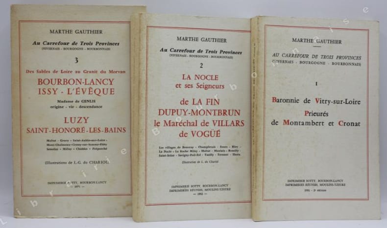 Rare réunion des trois volumes parus. Les tomes 1 et deux sont en seconde éditions, le tome 3 en édition originale. Nombreuses illustrations in-texte dessinées par L.-G. du Chariol. Tome 1 : Passé méconnu de la baronnie de Vitry-sur-Loire et des prieurés de Montambert et Cronat. Tome 2 : La Nocle et ses seigneurs, de La Fin, Dupuy-Montbrun, le maréchal de Villars, de Vogüé. Les villages de Beuvray , Champlevois, Fours, Hiry, La Nocle, La Roche Milay, Maltat, Maulaix, Remilly, Saint-Seine, Savigny-Poil-Fol, Tazilly, Ternant, Thaix.Tome 3 : Des Sables de Loire au granit du Morvan. Bourbon-Lancy, Issy-L'évêque. Madame de Genlis, origine- vie-descendance. Luzy, Saint-Honoré-les-Bains. Maltat, Grury, Saint-Aubin-sur-Loire, Mont-Chalmoux, Cressy-sur-Somme, Flétry, Semelay, Millay, Chiddes, Préporché.