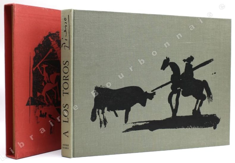 André Sauret Monte-Carlo 1961 In-8 oblong "à l'italienne" ( 250 X 325 mm ) de 153 pages, pleine toile gris-vert à la bradel, décor estampé en noir au premier plat, sous étui rouge illustré. EDITION ORIGINALE. Texte traduit en anglais par Patrick GREGORY. 103 reproductions en couleurs et en noir hors-texte imprimées par Draeger et 4 LITHOGRAPHIES ORIGINALES, dont une en 24 couleurs, de PICASSO réalisées spécialement pour cet ouvrage ( "La Pique" "Jeu de la Cape" "Les Banderilles" "Le Picador" ) tirées sur les presses de Mourlot Frères. Minimes usures à l'étui, très bel exemplaire.