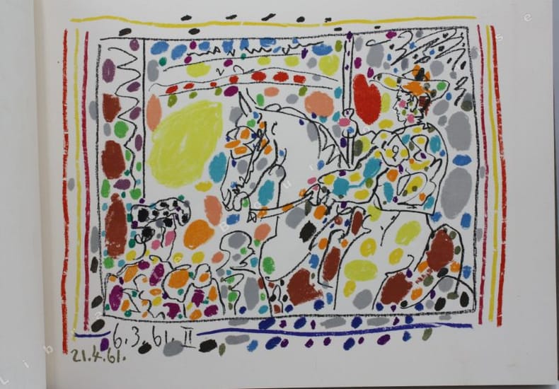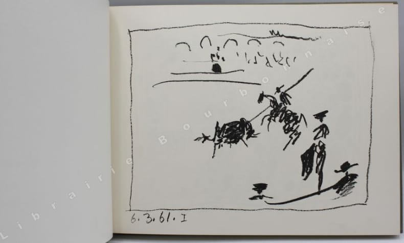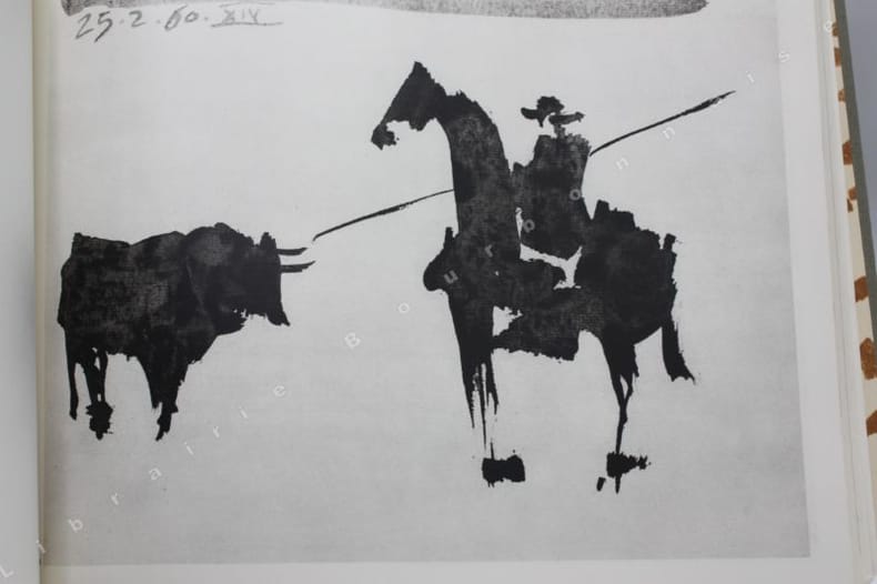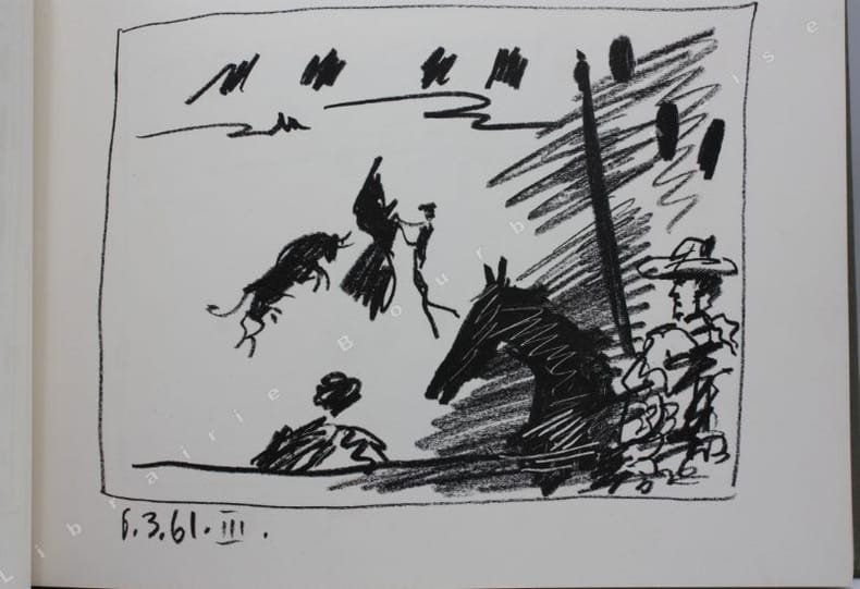 Edition originale dont le tirage n'est pas justifié. Le texte de Jaume (ou Jaime) Sabartès est illustré de 103 reproductions des dessins et lavis en noir de Picasso (certains reproduits en bistre). Les quatre lithographies, tirées sur les presses des frères Mourlot, représentent : La Pique ; Le Picador ; Jeu de cape ; Les Banderilles. Jaime Sabartés a été l'ami et le secrétaire de Picasso à partir de 1935 jusqu'à sa mort en 1968. Il est à l'origine de la fondation du musée Picasso de Barcelone