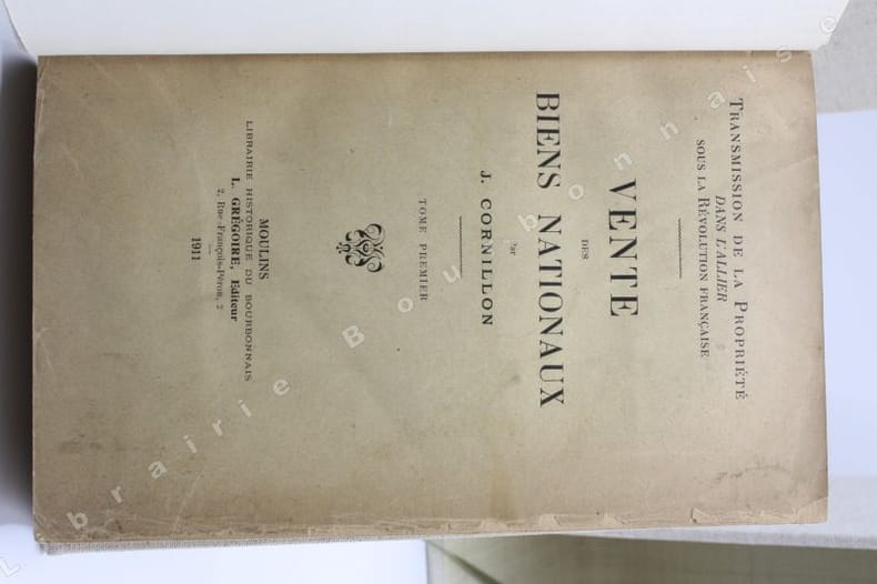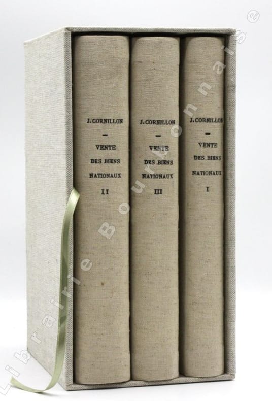 Edition originale. L'étude de Cornillon s'inscrit dans un mouvement de recherches nationales instituée en 1903 par la création de la "Commission de recherche et de publications des documents relatifs à la vie économique de la Révolution française" voulu par Jaurès, alors Vice-président de la chambre des Députés. De 1906 à 1924 paraissent au moins 11 volumes sur le sujets (Le Rhône, les Bouches du Rhône, l'Allier, les Vosges, l'Yonne, Ille-et-Vilaine, la Gironde, la Haute Garonne, l'Aveyron...). Cornillon à organisé son travail en trois partie ; la première concerne la vente des communautés religieuses, fabriques, chapitres et hôpitaux ; la deuxième, les biens des émigrés et des condamnés, la dernière, les églises et presbytères, les forêts et communaux. Il, fait précéder la transcription des actes de ventes d'une analyse, parfois trop succincte, des faits. Plus de cent ans après la Révolution, le sujet de la vente, et surtout de l'acquisition de biens nationaux, était encore un sujet sensible qui fit réagir de nombreuses personnes qui se sentaient "déshonorées" par les soupçons d'enrichissement qui portaient sur leur famille.