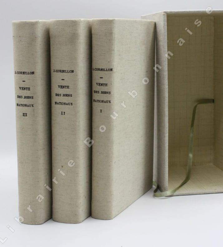 Moulins, Librairie historique du Bourbonnaise, Louis Grégoire, 1911, 1912 et 1913 ; 3 vol. in-8. 286 pp.-1 f. - 2 ff.-416 pp. - XIV-263 pp. Pleine toile écrue, couvertures des tomes 1 et 3 conservées. Étui en toile. Bel exemplaire. Le tome 3 est enrichi en fin de volume de 62 pages de photocopies tirées du "Bourbonnais sous la Révolution française" du même Cornillon (1888-1895), et de 3 feuillets de notes tapuscrites sur la famille du propriétaire de l'époque (1984) Paul Sauty de Chalon.