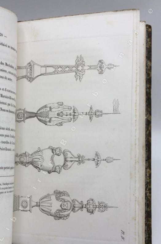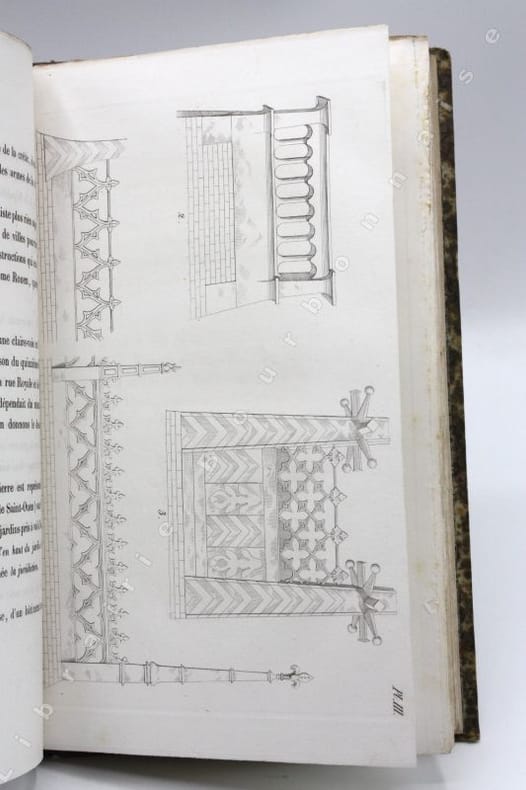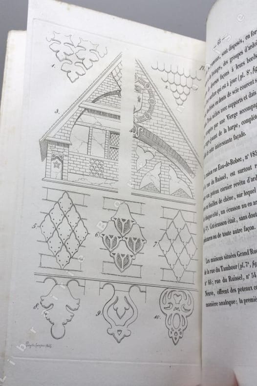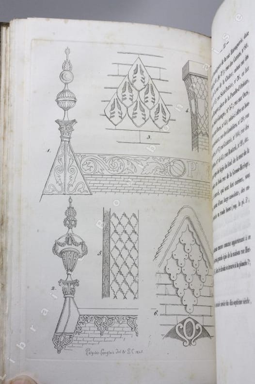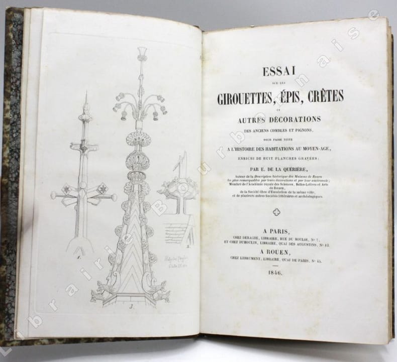 Édition originale, complète des 8 planches gravées illustrant cette histoire des épis de faîtage, girouettes, crêtes de toits ou encore des décorations en plomb ou en ardoise du Moyen Age, d'après les observations de l'auteur sur les anciens monuments, essentiellement du nord de la France (Normandie, Paris, Rouen...). Polyclès Langlois est un dessinateur et graveur originaire de l'Orne ; il produisit des vues des monuments de Rouen et fit l'essentiel de sa carrière à la Manufacture de Sèvre. Il avait déjà illustré la "Description historique des maisons de Rouen", publié en 1841 par Eustache de La Quérière. Polyclès Langlois