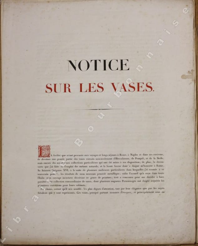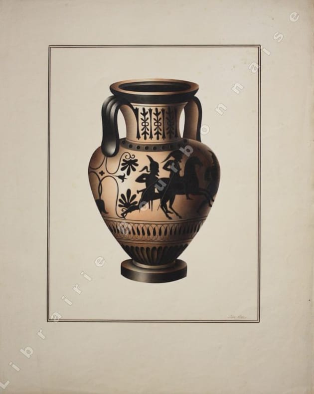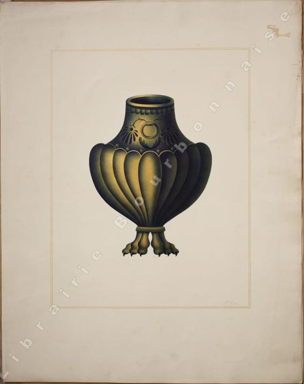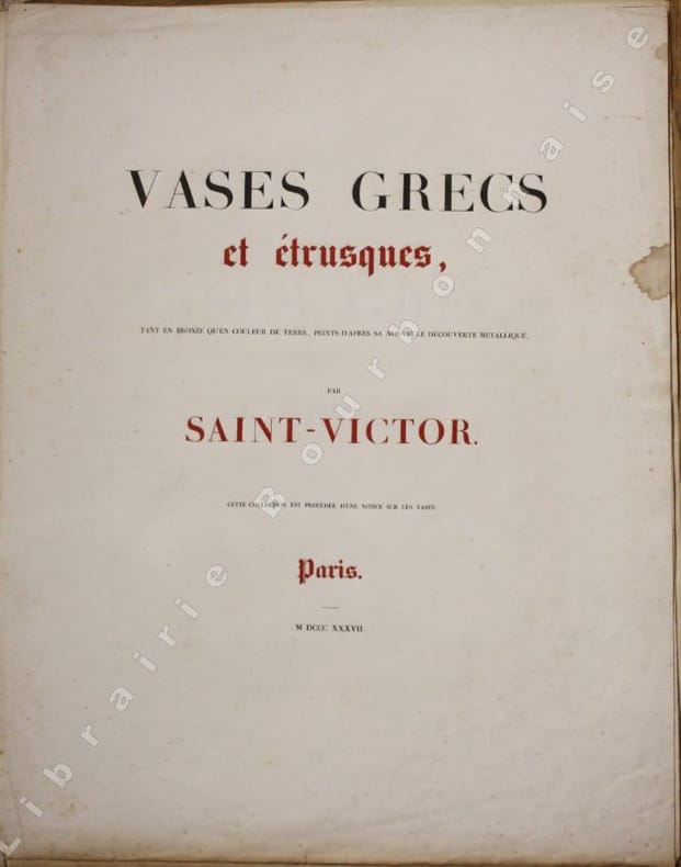 Ce Monsieur Beauvalet, dit Chevalier de Saint-Victor est une énigme qui se rattache au Bourbonnais : l'adresse de publication de son ouvrage est à Paris, et chez lui à Moulins. Mais cet artiste est inconnu des bibliographies locales. Il est aussi l'auteur d'un "Manuel de peinture orientale et chinoise en relief" publié conjointement à Paris par Roret et Chamerot, et à Moulins par Pierre-Antoine Desrosiers en 1832 (in-18, 129 pp.-5 pl. en noir et en coul.). Deux informations qui le rattachent à notre vieille province sans qu'on en sache les motifs. Il serait né à Paris en 1780 et décédé en 1857, reconnu actif entre 1832 et 1845, il est connu pour avoir publié une série de 24 planches de vases selon une technique au pochoir. Cependant, dans la courte notice qui précède les deux planches de cette première livraison, Saint-Victor ne précise pas réellement la technique utilisée, il parle de "nouveau procédé métallique" et "ce genre de peinture en véritable bronze de couleur antique, que j'ai découvert..."'.Il faut se reporter à un autre ouvrage qu'il avait publié en 1835 : "Aquarelle-miniature perfectionnée, reflets métalliques et chatoyans et peinture à l'huile sur velours en six leçons... par le chevalier Saint-Victor" à Milan chez F. Rusconi, 1835, (in-8, 290 pp. avec des planches en noir et en couleurs), pour avoir une idée plus précise de la technique d'exécution des présentes planches. La technique du pochoir alliée à l'utilisation de peinture particulière est attestée par la présence de petits trous d'épingles aux angles des compositions pour pouvoir positionner les différentes feuilles découpées. Il obtient un rendu en effet chatoyant et veloutés avec une véritable impression de relief. Toujours dans la notice de présentation, Saint-Victor précise qu'il a dessiné ces vases à partir des observations qu'il en a faites lors de ses séjours à Rome, à Naples et dans les environs, (Herculanum, Pompéi et en Sicile), ainsi que dans des collections particulières, sous le pontificat de Grégoire XVI (1831-1846). Il aurait séjourné en Italie entre 1833 et 1836. Outre les ouvrages mentionnés, Saint-Victor est l'auteur d'un "Manuel complet du fabricant de cadres, passe-partout, etc" paru dans l'encyclopédie des Manuel- Roret, vers 1850. Deux albums de calligraphies réalisés par Beauvalet, réunissant 223 aquarelles et peintures originales sont passés en vente chez Christie's, Paris le 5 juillet 2023 (lot 59). Un ouvrage portant exactement le même titre que le nôtre, paru à Paris à la date de 1837, avec un frontispice daté de 1845, et comportant 94 planches (sur 96) a été vendu par la Maison de vente Giquello en novembre 2023 (lot 107), ce qui indique que l'artiste de s'en est pas tenu aux 24 livraisons initialement prévues. Ceci est confirmé par la vente d'un autre exemplaire (Chritie's paris, 27 mars 2003, lot 166) d'un "Magnifique recueil de dessins au nombre de 97 y compris le titre fait en 1845 par Beauvalet de St Victor d'après les originaux d'Herculanum et Pompéi de la Sicile et des Musées d'Italie. Ils sont peints dans leur couleur naturelle, en bronze et en terre avec la plus rare perfection. Ce splendide recueil avait été commandé par le Roi Louis Philippe". On sait enfin que l'ancienne Impératrice Marie-Louise (seconde épouse de Napoléon, devenue Duchesse de Parme) commanda à Beauvalet une série de "dessins" de fruits et de papillons. Un recueil de 97 dessins originaux d'archéologie par "Beauvalet de Saint-Victor daprès les originaux dHerculanum, de Pompéi, de la Sicile et des musées dItalie », faisait partie de la Bibliothèque de Joseph Techener Père promis à la vente chez Sotheby à Londres, mais qui brûla lors de l'incendie de cette ville le 29 juin 1865. (Voir larticle consacré à cet artiste par Claire Lyons, "Beauvalet de Saint-Victor's "Vases grecs et étrusques" (pp. 97-104 dans : Excalibur : Essays on Antiquity and the History of Collecting in Honour of Arthur Macgregor. Oxford, Archeopress, 2013).