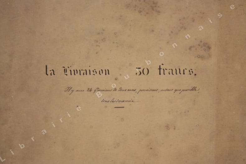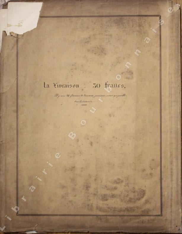 Paris, Rittner et Goupil - Moulins, chez l'Auteur, 1837 ; in-plano (57 x 44 cm). 4 ff. de texte et 2 planches en couleurs. Couverture illustrée en noir, titre vraisemblablement tracé au pochoir, adresses d'édition manuscrites, couverture jaunie et salie, des rousseurs sur l texte. Planches fraîches. Le matériel typographique utilisé est proche de celui employé par P.-A. Desrosiers pour l'impression de l'Ancien Bourbonnais à la même époque. Cette publication c'est faite en 12 livraisons et 24 planches. Les deux planches présentent ici sont signées de la main de l'artiste et réalisées sur papier Bristol.