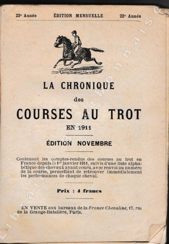 Chronique "contenant les comptes-rendus des courses de trot en France depuis le 1er janvier 1911, suivis d'une liste alphabétique des chevaux ayant couru, avec renvoi au numéro de la course, permettant de retrouver immédiatement les performances de chaque cheval". Liste alphabétique des noms de lieux en début de volume.