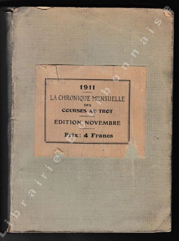 Paris, La France chevaline, 1911, 22e année ; in-12, broché. VIII-623 pp. Couverture de papier vert pâle, étiquette de titre en papier sur le premier plat. Petits plis angulaires. Bon état.