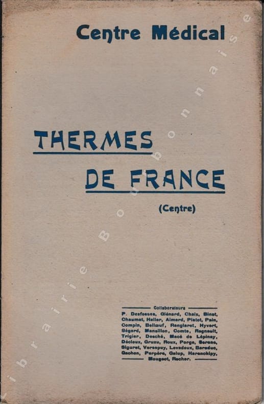 Descriptions des particularités des eaux et des traitements médicaux pratiqués dans les villes thermales de Vichy, Bourbon-Lancy, Saint-Aré-Decize, Pougues-les-Eaux, Saint-Honoré-les-Bains, Bourbon-l'Archambault, Néris-les-Bains, Evaux-les-Bains, Saint-Nectaire, Châtel-Guyon, La Bourboule, La Mont-Dore et Royat