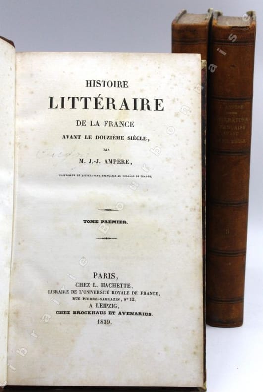 Fils du grand physicien André-Marie Ampère, la carrière de Jean-Jacques n'a pas eu à faire rougir son père. A trente-deux ans il professe un cours de littérature française au Collège de France auquel assiste Chateaubriand... De ce cours, dans lequel il met en évidence le relèvement culturel des carolingiens dans le domaine des arts, des sciences, de la littérature... il tire son « Histoire de la littérature française avant le XIIe siècle », traitant dans la première partie de la culture des populations ibériennes, celtiques, du rôle des bardes, des influences phéniciennes, grecques et romaines sur la Gaule. Puis il fait le point sur la littérature avant le christianisme et jusqu'à l'arrivée des barbares (saint Irénée, les gnostiques, Lactance, Ausone, saint Paulin, Sulpice Sévère, l'arianisme, saint Hilaire de Poitiers, saint Ambroise, saint Martin, Cassien...). Dans la suite du deuxième volume il traite du pélagisme, de saint Prospère, de Rutilius Numatianus, de l'influence germanique sur les lettres et la culture, puis de la culture chrétienne après les invasions (saint Avit, saint Césaire, saint Apollinaire Grégoire de Tours, Fortunat...). En dernier il montre comment Charlemagne devient le restaurateur des lettres et prépare la renaissance de la poésie, de la littérature, de l'histoire au XeI et XIIe siècles.