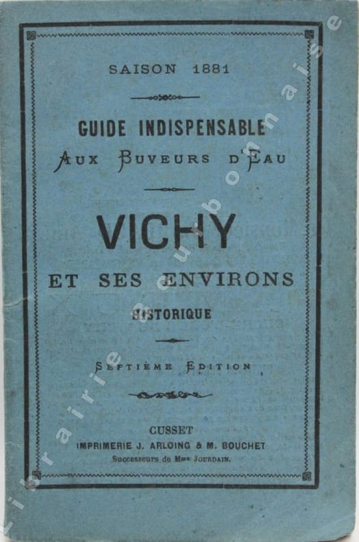 Cusset, J. Arloing et M. Bouchet (successeurs de Mme Jourdain), 1881 ; petit in-12 (13,7 x 9 cm), broché. 108 pp. Couverture bleue imprimée. 8 gravures pleines pages, publicités illustrées pour les sources Larbaud sur le contreplats sup. et la quatrième de couverture. Bel exemplaire.