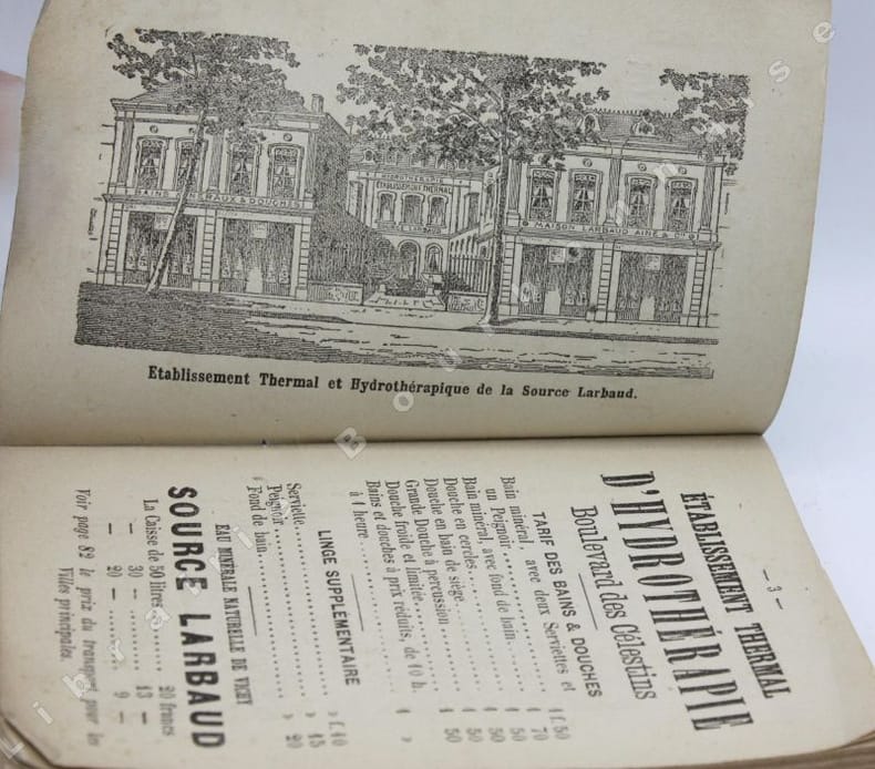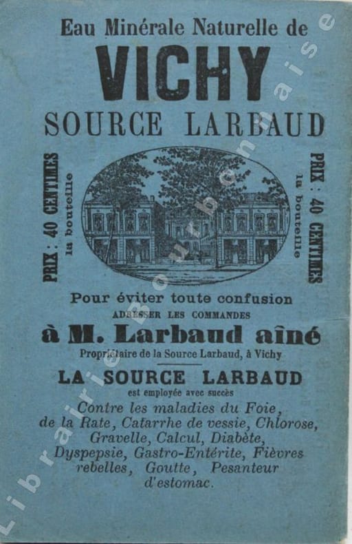 Ce petit guide aux eaux de Vichy a visiblement été composé pour faire la promotion des sources et établissements de bains de M. Larbaud Aîné (à ne pas confondre avec son frère et concurrent Nicolas, père de l'écrivain Valery Larbaud) : outre les publicités mentionnées sur la couverture on y trouve encore deux pages sur l'établissement thermal hydrothérapique de la source Larbaud (avec gravure), un historique de la Maison Larbaud, un rapport de l'Académie de médecine sur la source Larbaud, le tarif d'expédition de la caisse de 50 bouteilles d'eau Larbaud ! Cette publication s'inscrit aussi dans le climat de concurrence que se livrait les deux frères Larbaud pour l'exploitation et la commercialisation des eaux et produits dérivés (sels, sucre d'orge...) et dont le texte se fait abondamment l'écho. (Merci à M. Pascal Chambriard pour les corrections apportées).