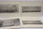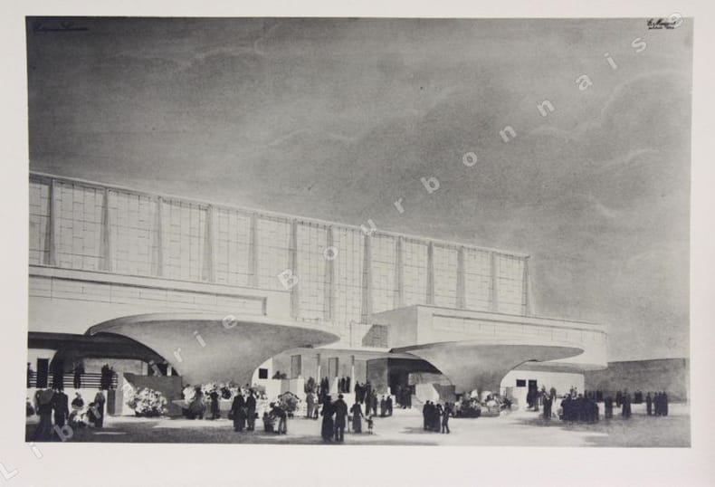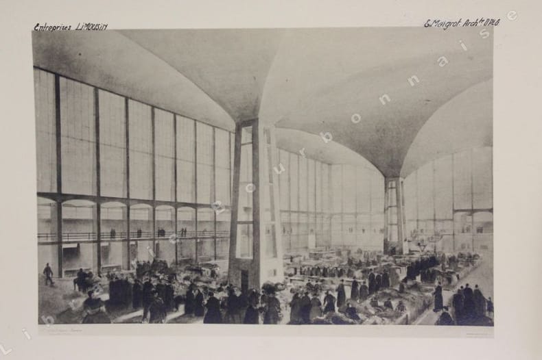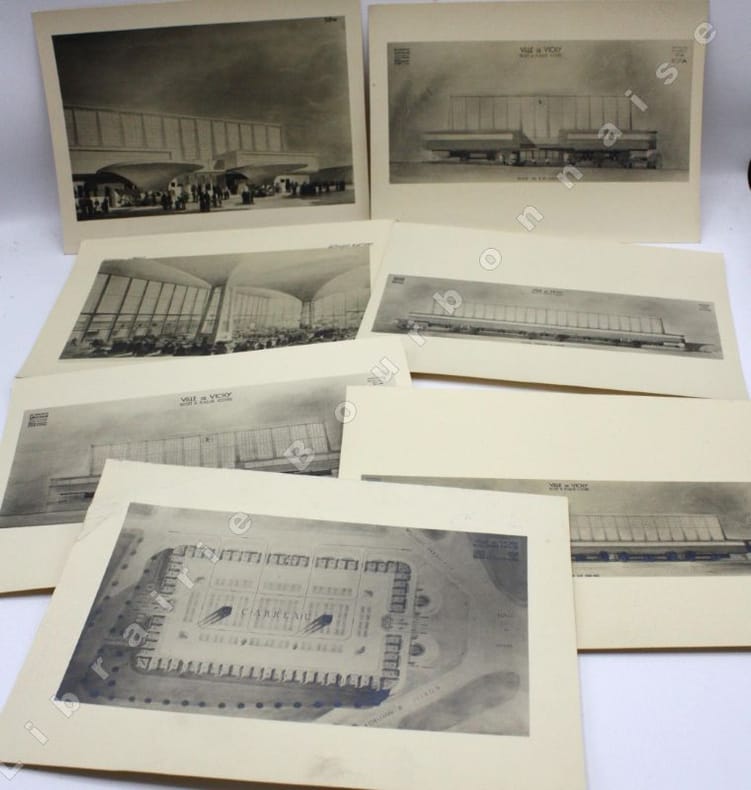 7 photographies sur papier baryté, format 17 x 22,5 cm, de reproductions de projets d'architecture pour la construction du "Grand Marché" de Vichy en 1930. Les photos sont de Paul Cadé à Levallois-Perret. Les projets sont signés de l'architecte Emile Maigrot (1880-1961). Il avait déjà concouru pour la construction des abattoirs de Vichy en 1910. En 1923 il remporte le concours pour les halles de Reims (1923), projet capital dans sa carrière, il projette la reconstruction de l'abattoir et du marché de Rouen (1924). Il réalise en 1936, en collaboration avec Le Marec, un immense marché couvert associé à une salle des fêtes à l'étage à Nantes. En 1930 il présente à nouveau un ambitieux projet pour le Marché couvert de Vichy qui ne sera pas réalisé. Lors de l'Exposition internationale des arts et techniques de Paris, en 1937, il est désigné architecte en chef coordinateur du Centre régional, qui réunissait des représentants de Sociétés provinciales d'architectes de 27 régions.