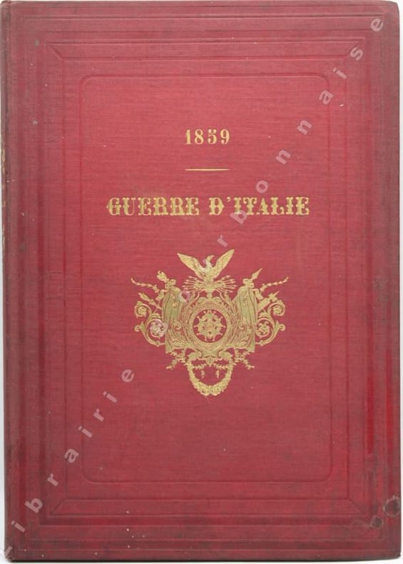 Paris Librairie de l'Illustration 1859 In folio (38,5 x 27,5 cm.) 208p. demi-reliure havane, dos en maroquin, plats de percale, armes impériales sur le plat supérieur, tranches dorées.Frontispice et nombreuses gravures in et hors-texte à pleine page, portraits, scènes de historiques et de genre par Bertall, Blanchard, Dulong, Férat, Godefroy-Durand, Guesdon, Janet-Lange, Lebreton, Provost, Rouargue, Tirpenne, Worms.Rare et bel album historique sur la lutte en entre l'armée franco-piémontaise et l'armée d'Autriche. De nombreuses événements sont reproduits par l'image, préfigurant ainsi le photo-reportage de guerre.Ex-dono manuscrit à Monsieur B. de La Roncière par Louis Laroche, bibliothécaire à la Bibliothèque Nationale (carte de visite collée sur la page de garde à coté de l'inscription).