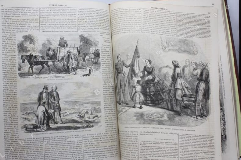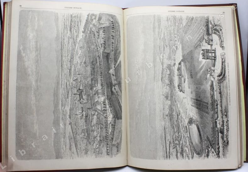 Un volume petit in-folio (37, 5 x 27, 5 cm), demi reliure cuir couleur verte, plats de couleur verte également, dos lisse avec de faux caissons et titre en lettres dorées. L’ouvrage compte 208 pages dont une table des matières. Il s’ouvre sur toute une série de fontispices dont divers portraits: la famille imperiale française , Victor Emmanuel, Roi de Sardaigne, SAR le Prince Humbert de Piémont etc.Le texte commence évidemment par les causes de la guerre: ‘La domination autrichienne en Italie s’est proposé un but qui n’a pu être atteint dans aucun temps par aucune puissance humaine: l’anéantissement d’une nationalité, la compression de tous les instincts généreux qui appellent un peuple à l’indépendance. Cette politique exigeait un emploi immodéré de la force et de la violence: l’Autriche ne les a point épargnés” etc. Il s’ensuit un extraordinaire livre d’images qui nous ferait presque regretter l’avénement de la photographie de presse quelques décenies plus tard. Car à cette époque (1859) où la photographie était encore balbutiante , où la photographie de reportage paraissait encore une chose inimaginable (vu la lourdeur des appareils, la longueur des temps de pause etc.) il existait des quantités de dessinateurs et de graveurs dont le métier était de dessiner vite et bien comme le font aujourd’hui les reporters qui prennent des photos. Et donc en 208 pages nous allons voir un luxe inoui d’images: 265 gravures sur bois! La préparation des troupes, l’acheminement de celles-ci vers les lieux d’opération, les 1ères escarmouches, les premières batailles, les Victoires, Magenta, Palestro, Solférino, Milan, Rome, Florence, Mantoue etc. Et au retour l’Entrée solennelle des troupes place Vendôme à Paris, l’Empereur Napoléon III à cheval avec le Prince Impérial entre les genoux etc.Oui, c’est un beau livre d’images et un moment de joie populaire et nationale dont les Français avaient certes besoin mais qui sera malheureusement rééquilibré quelque dix ans plus tard par la défaite de la France devant la coalition des états allemands, Prusse en tête, qui amènera la Commune de Paris et la fin du second Empire.Notre exemplaire, malgré quelques petites traces d’âge et d’usage (mors partiellement restaurés, petits accrocs du papier réparés et quelques taches sans gravité) peut être dit globalement en état TRÉS SATISFAISANT.