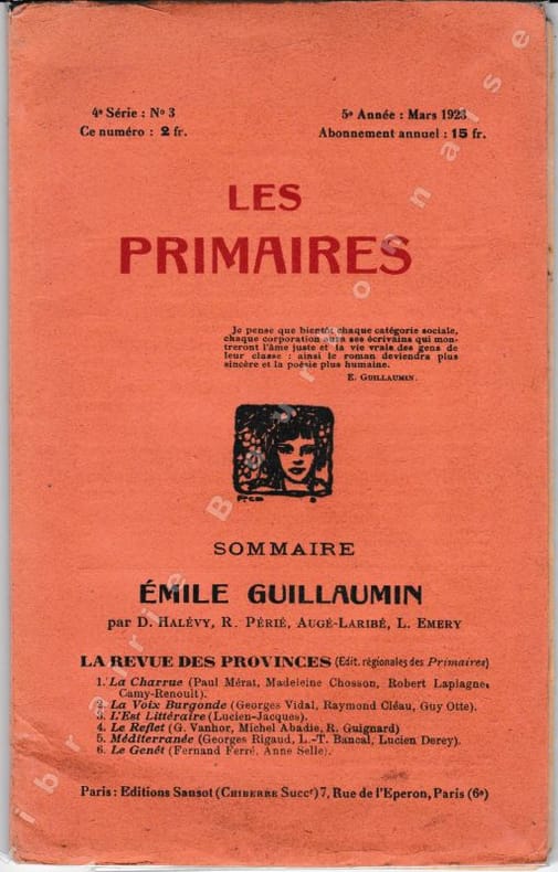 Paris, Les Primaires, revue d'étude et d'art, (Editions Sansot), 5e année, mars 1923 ; plaquette in-8, agrafée. pp. 85 à 126. Portrait hors-texte de Guillaumin avec fac-similé d'écriture. Complet du supplément de XVI pp. contenant un extrait de "L'école du citoyen" de R. Périé. Bon état.