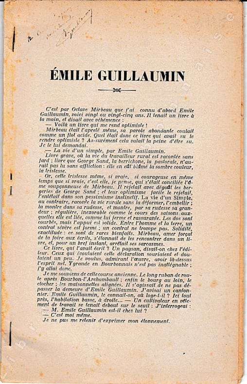 Envoi autographe de Guillaumin, partiellement effacé. Ouvrage consacré à l'écrivain bourbonnais par les auteurs cités au titre : présentation par Daniel Halévy ; critique de "La vie d'un simple" par Raphaël Périé ; l'oeuvre littéraire par L. Emery ; Guillaumi journaliste par Michel Augé-Laribé. Suivi de quelques morceaux choisis.