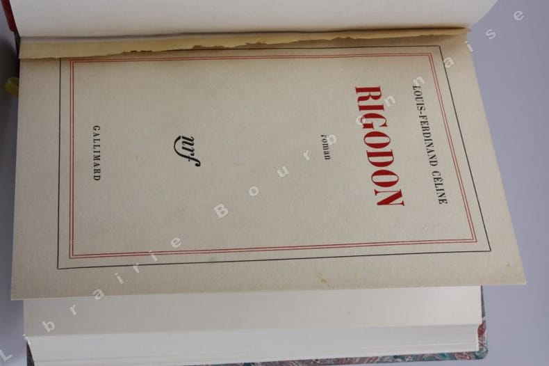 "Édition originale, posthume, du troisième volet de la ""trilogie allemande"" ou ""trilogie historique"": on continue d'y suivre la fuite à travers l'Allemagne dévastée de Louis-Ferdinand et ""Lili""en compagnie de l'acteur Robert Le Vigan et du chat Bébert. Un des 115 exemplaires numérotés sur pur fil Lafuma-Navarre (venant après 43 Hollande); celui-ci n°97. Lucette raconte: ""Quelques jours avant sa mort, je lui ai dit: ""On vend tout, on vend la maison, on s'en va au bord de la mer, toi, tu laisses ton travail, tu ne finis pas ton livre, on s'en va."" Mais il a voulu finir son livre, pour que j'aie quelque chose après sa mort, il me l'a expliqué très clairement. Il a mis deux ans à peine pour écrire Rigodon, il s'est surmené et tout était fini, en brouillon, à la veille de sa mort, il venait d'écrire la dernière page."" Il semblerait que ce témoignage ""trop beau pour être vrai"" n'en soit pas moins parfaitement véridique, et que le point final ait été mis par Céline au roman le 30 juin, son attaque fatale terrassant l'écrivain le 1er juillet après qu'il en eut averti Gallimard… La question de l'état réel d'achèvement du manuscrit reste cependant ouverte, car même cette version très retravaillée -on possède non pas un mais deux manuscrits du livre, entre lesquels l'écart de qualité et l'ampleur des changements opérés sont plus que considérables- laisse encore à certains céliniens une impression de provisoire, qui, souligne Frédéric Vitoux, ""n'empêche nullement de nombreux passages d'accéder à la dimension des meilleurs pages céliniennes"". Et surtout le manuscrit demeurait… un manuscrit, d'autant plus difficile à décrypter d'avoir été tant travaillé! Le texte de l'édition fut long à être établi, fruit du labeur d'André Damien complété par l'oeil de François Gibault, auteur de la préface, exécuteur testamentaire et futur biographe de Céline. ""Céline se savait pressé par le temps. Il écrivait comme on mène une course, gêné par l'ankylose qui gagnait son bras et sa main. Son écriture s'en ressentait, devenait tremblée, hésitante, parfois illisible. Pourtant, malgré l'effort physique qui transparaît à chaque page, il relisait, raturait, corrigeait, à la recherche du mot juste, de la teinte qu'il fallait et de la bonne cadence de chaque phrase. […] C'est le manuscrit le plus poignant qui soit, celui d'un homme qui se meurt"" (François Gibault, Céline, Paris, Mercure de France, 1981). Très bel exemplaire broché tel que paru. Jean-Pierre Dauphin et Pascal Fouché, Bibliographie des écrits de Louis-Ferdinand Céline, 69A1."