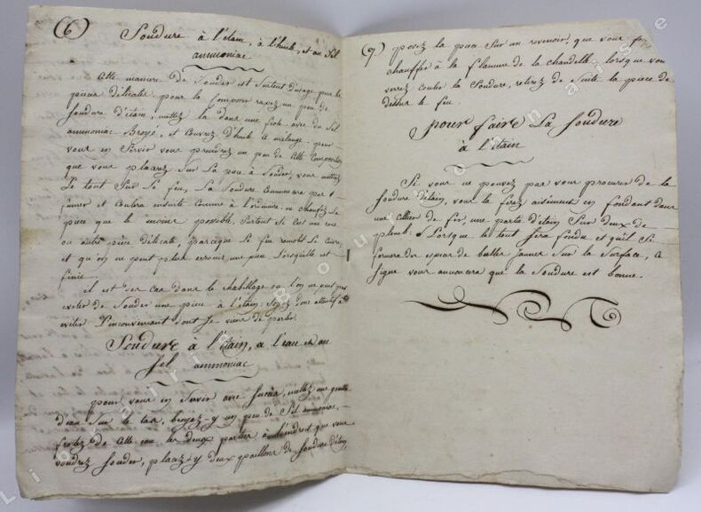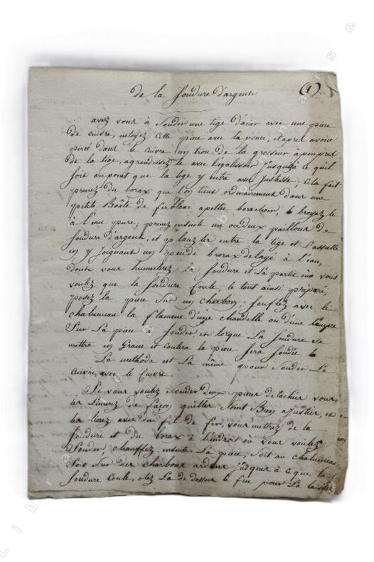L'écriture est fine, appliquée et très lisible. L'auteur s'adresse directement au lecteur : "Avez vous à souder une tige d'acier avec une pièce de cuivre,...", et donne les recettes de la soudure d'argent entre deux pièces d'acier et de cuivre, deux pièces de cuivre, pour souder une virole, ou encore de faire la soudeur d'argent au tiers et au quart "la plus propre pour l'horlogerie", la soudure à l'étain, au sel d'ammoniac. Les méthodes de soudures décrites sont semblables à celles données dans l'Encyclopédie Diderot d'Alembert (tome 15, pp. 390-395, article attribué au Baron d'Holbach) sans toutefois les copier ; elles sont ici données dans un esprit pratique et semble s'adapter plus particulièrement à l'orfèvrerie ou la bijouterie.