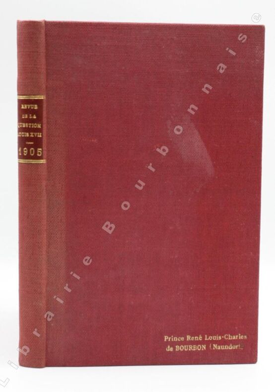 Paris, Daragon, 1905 ; 3 fascicules reliés en un volume in-8. 156 pp. Couvertures conservées. Pleine toile vermillon, dos lisse, pièce de titre rouge, supra ex-libris en caractères dorés sur le coin inférieur du plat supérieur. De la bibliothèque de Louis-Charles Bourbon (Naundorf), descendant Karl-Wilhelm Naundorff qui se prétendait être Louis XVII.