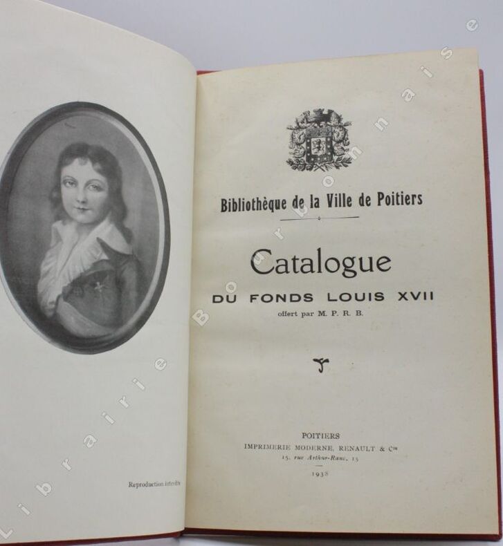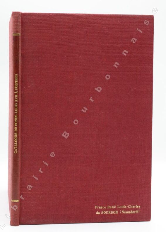Poitiers, Renault & Cie, 1938 ; in-8.-5 ff- 1 illustration hors-texte en noir.- 64 pp.- 4 ff. Pleine toile vermillon, dos lisse, pièce de titre rouge en long, supra ex-libris en caractères dorés sur le coin inférieur du plat supérieur. De la bibliothèque de Louis-Charles Bourbon (Naundorf), descendant Karl-Wilhelm Naundorff qui se prétendait être Louis XVII. 35