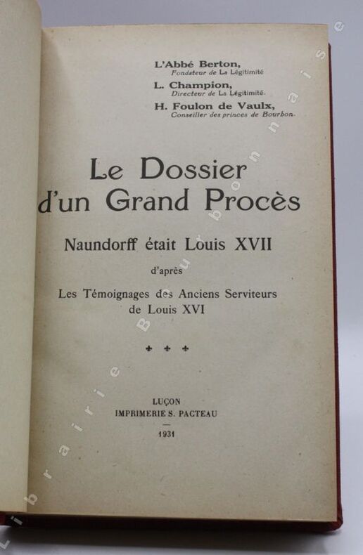 Luçon, S. Pacteau, 1931 ; in-8.-3 ff. XX.- 484 pp.-3 ff. Pleine toile vermillon, dos lisse, pièce de titre rouge, supra ex-libris en caractères dorés sur le coin inférieur du plat supérieur. De la bibliothèque de Louis-Charles Bourbon (Naundorf), descendant Karl-Wilhelm Naundorff qui se prétendait être Louis XVII. Signé par Monsieur Louis de Bourbon. 70
