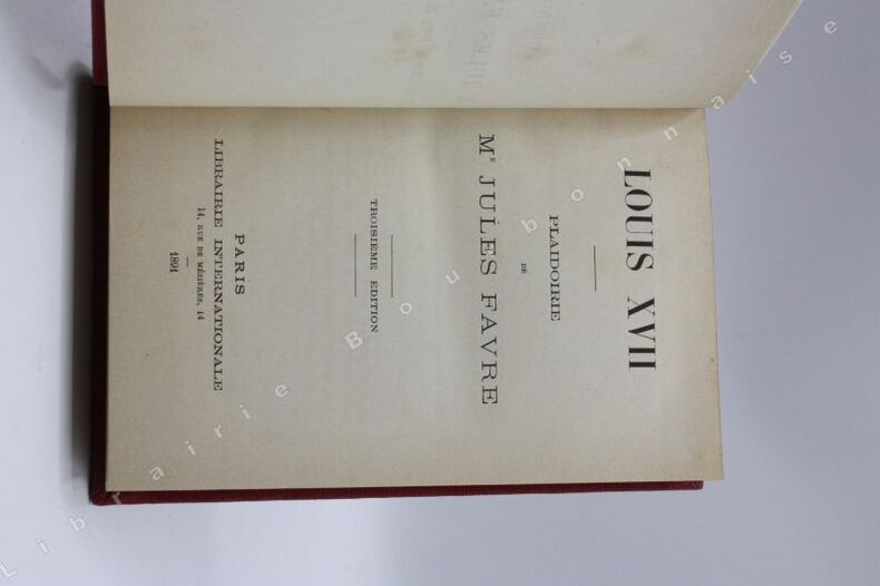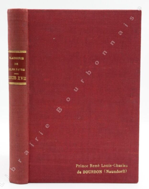 Paris, librairie internationale, 1891 ; in-8. 3 ff.-378 pp.-1 f. Pleine toile vermillon, dos lisse, pièce de titre rouge, supra ex-libris en caractères dorés sur le coin inférieur du plat supérieur. De la bibliothèque de Louis-Charles Bourbon (Naundorf), descendant Karl-Wilhelm Naundorff qui se prétendait être Louis XVII.