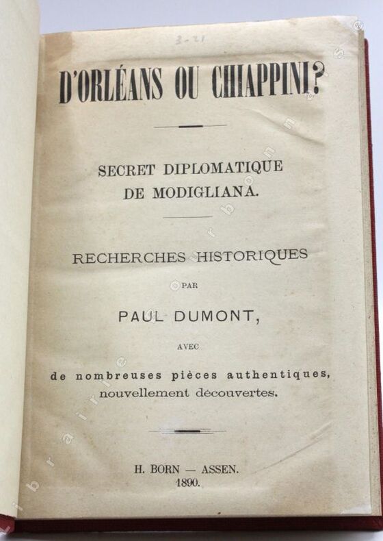 Assen, H. Born, 1890 ; in-8. 2 ff.-2 planches hors-texte en noir-224 pp.-3 ff. Pleine toile vermillon, dos lisse, pièce de titre rouge en long, supra ex-libris en caractères dorés sur le coin inférieur du plat supérieur. De la bibliothèque de Louis-Charles Bourbon (Naundorf), descendant Karl-Wilhelm Naundorff qui se prétendait être Louis XVII.
