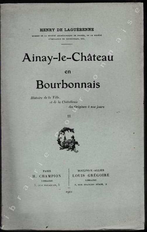 Rare édition originale complète en deux volumes. Le tome premier traite de l'histoire civile et seigneuriale (marchands, bourgeois, le château et la châtellnie) jusqu'à la fin de l'ancien régime, et des institution avant 1789 : la justice, les impôts, le régime municipal, la milice bourgeoise. Au second volume on trouve les établissements religieux et charitables, les écoles, les chirurgiens, apothicaires, les sages-femmes, les professions libérales ; puis d'Ainay sous la Révolution et à l'époque contemporaine. La dernière partie est consacrée aux environs d'Ainay-le-Château.