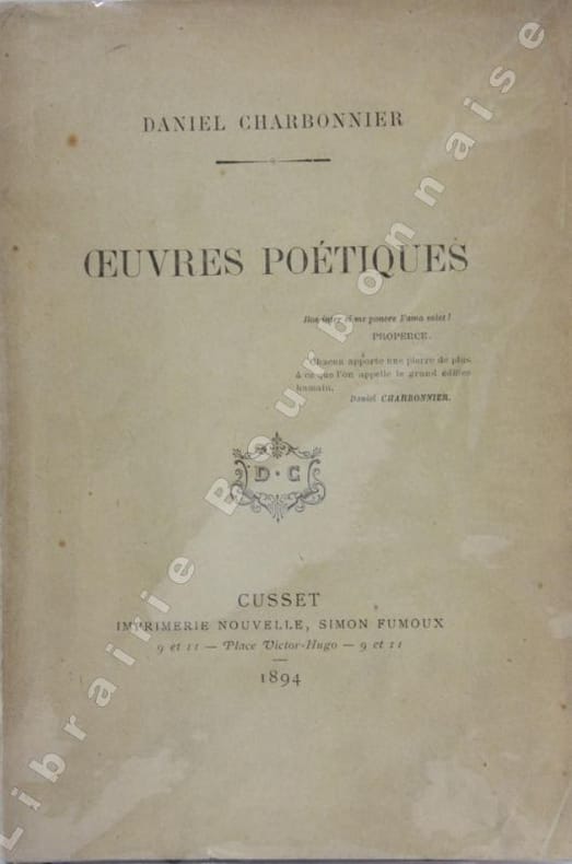 Cusset, Imprimerie Simon Fumoux, 1894 ; in-8, broché. 238 pp. Portrait en frontispice et 3 dessins hors-texte. Couverture un peu jaunie. Bel exemplaire.