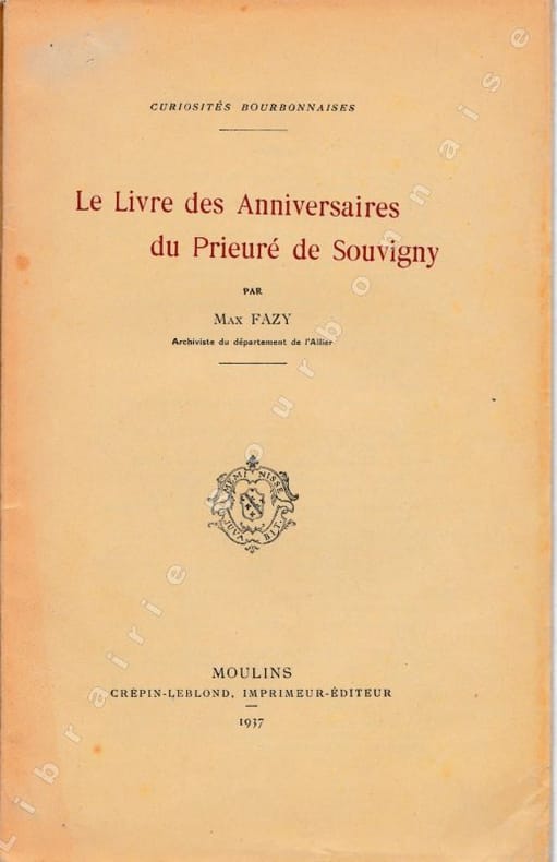 Le livre des anniversaires de Souvigny est un manuscrit latin de la seconde moitié du XVème s. rélisé pour la prieur Dom Cholet, et conservé à la Bibliothèque de Moulins. C'est un registre donnant la liste des offices qui sont fait pour la mémoire de religieux, bienfaiteurs ou associés spirituels, mentionnant au passage leurs qualités, leurs fonctions, les dons ou travaux qu'ils ont fait ou financés, les dates de leurs morts ou de leurs activités... Max Fazy donne une traduction des principaux passages de cet important livre dans lequel on peut suivre l'évolution spirituelle et matérielle du prieuré.