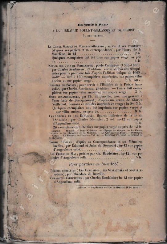P., Poulet-Malassis et De Broise, 1857 ; in-12, broché. 2ff.-XXIII-278pp. Des rousseurs et une importante mouillure touchant le second plat de couverture et les pages 250 à 278.