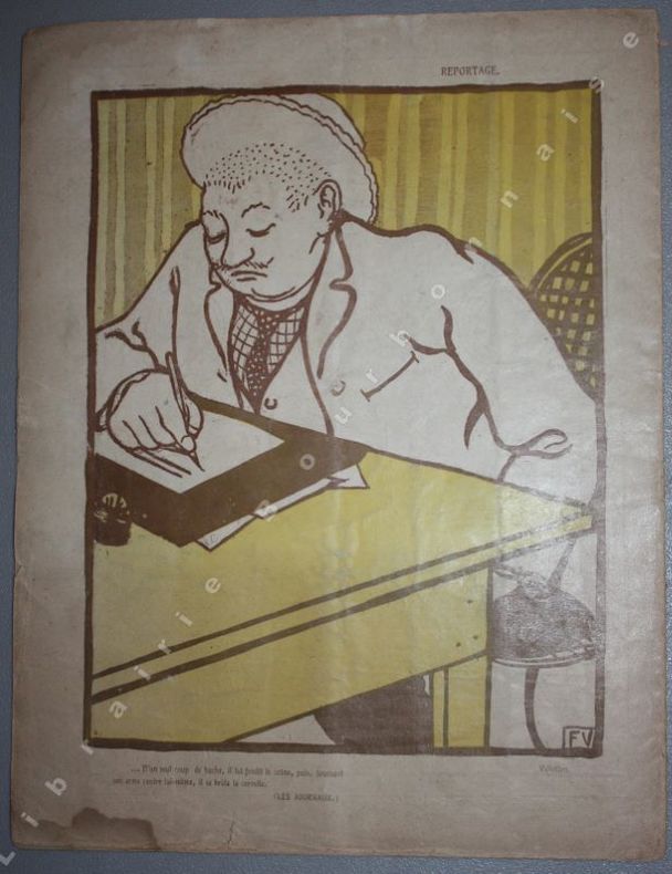 Célèbre et éphémère revue qui parue du 21 avril au 24 octobre 1903 et qui ne compte que 31 numéros. Ce journal satyrique et politique, anticlérical et antisémite, a été créé sur le modèle de L'Assiette au beurre. On y retrouve des illustrateurs communs : Hermann-Paul, Félix Vallotton, Steinlen, Pierre Bonnard, A. Willette, Roubille, Cappiello, Sem, Paul Iribe... Les collaborateurs furent nombreux et réputés : A. Jarry, A. France, J. Renard, O. Mirebeau, Franc-Nohain, Tristan Bernard, Charles-Louis Philippe...Ce N° présente une couverture avec un dessin en couleurs par Hermann-Paul ; une double page en bistre par Roubille ; on trouve ensuite des dessins en noir de Hermann-Paul, KupKa, Steinlen, P. Iribe ; la 4ème de couverture est un dessin en couleurs par Félix Vallotton. Les textes sont de : Alfred Jarry, Charles-Louis Philippe et Henry Creil.