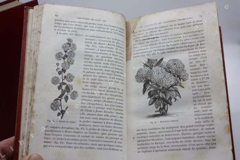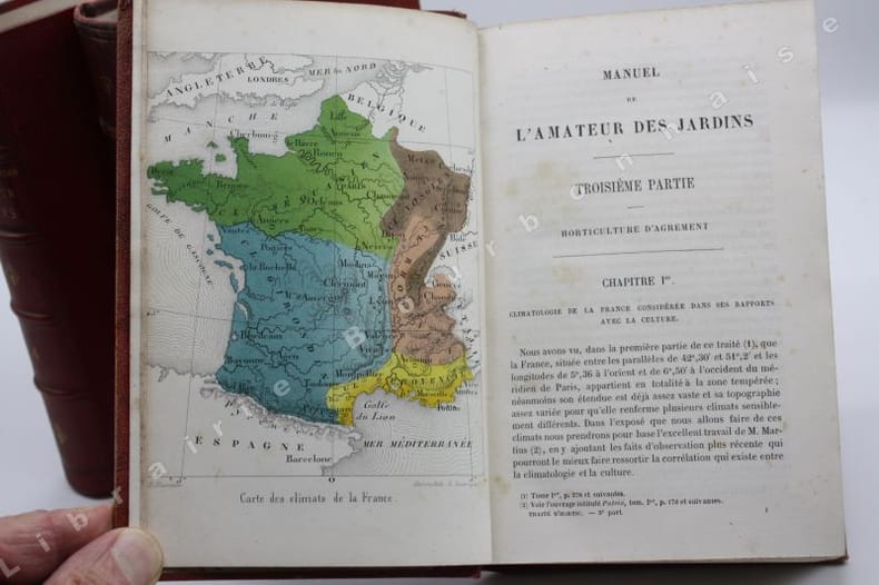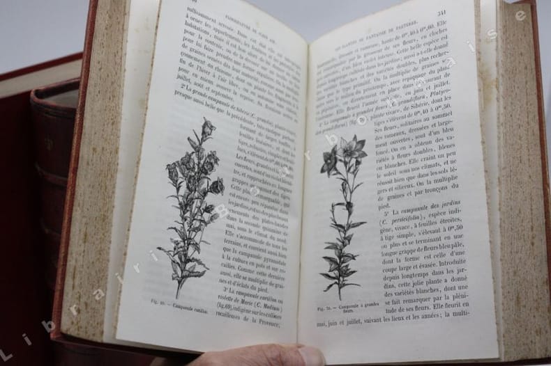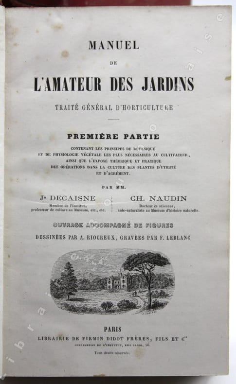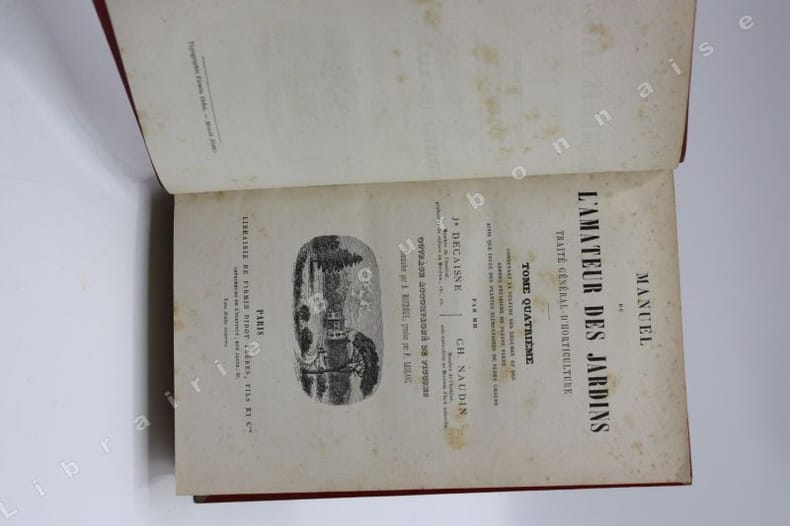 Ouvrage accompagné de 751 figures in-texte dessinées par Riocreux, gravées par P. Leblanc. Joseph Decaisne est né à Bruxelles en 1807. Il entre au Muséum national d'histoire naturelle de paris en 1824 comme jardinier, mais gravit rapidement les échelons et devient assistant-naturaliste de V. de Jussieu à la chaire de botanique rurale. Il étudie alors des plantes rapportées d'Asies par des explorateurs et publies en 1837 ses recherches sur la garance et ses propriétés colorantes. En 1836 il dirige une nouvelle édition de la Maison rustique du XIXe siècle. Membre de l'Académie des sciences à partir de 1847, il obtient en 1850 la chaire de culture du Muséum... On lui doit la rédaction du "Jardin fruitier du Muséum" (1858-1875) dans lequel il décrit toutes les espèces d'arbres fruitiers qui y sont cultivés (dont 400 sortes de poiriers). Avec Charles Naudin il élabore de traité d'horticulture. Naudin c'est illustré par ses travaux sur l'hybridation et l'acclimatation des plantes "exotiques"; il publie un très remarqué "Manuel de l'acclimateur" (Paris, 1888) et organise plusieurs jardins botaniques dans le Sud de la France, dont celui de la Villa Thuret à Antibes, ou participe à des plantations de palmiers comme à la villa Saint-Malo du baron de Vilmarest à Argelès-sur-Mer.
