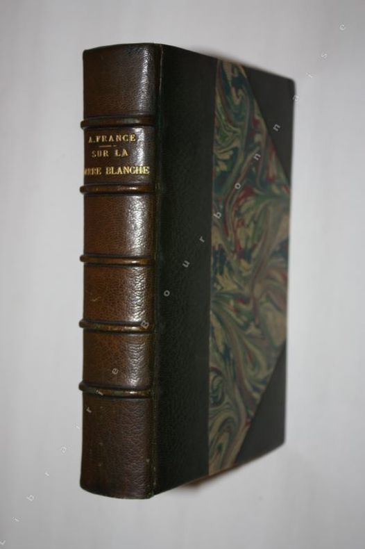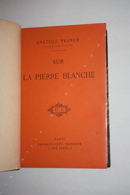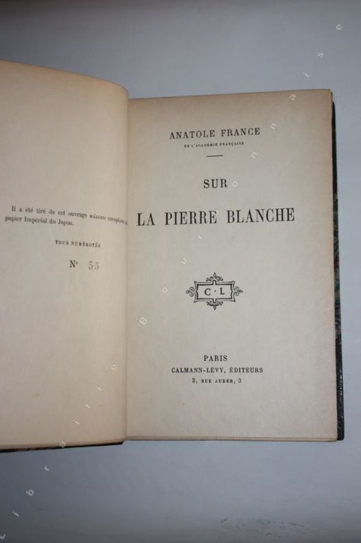 Edition originale, un des 60 exemplaires sur papier impérial du Japon (seul grand papier). Roman utopique et sociale, La pierre blanche est aussi une critique philosophique de la société du XIXe siècle. A. France fait discourir dans le décor des ruines de la Rome antique, des amis sur le sort des peuples, le racisme et l'antisémitisme, le stoïcisme et sa critique, le développement du christianisme et le procès de Paul de Tarse. Luvre traite de l'évolution de lHumanité, et esquisse la possibilité d'une création des États-Unis du monde. Elle se termine par la description d'un idéal socialiste/communisme en l'an 2270. Utopie ou dystopie ?