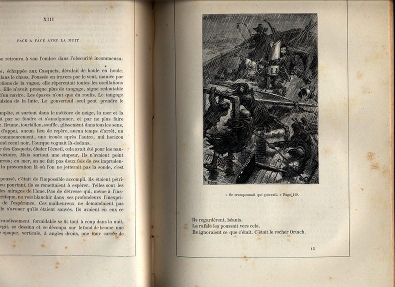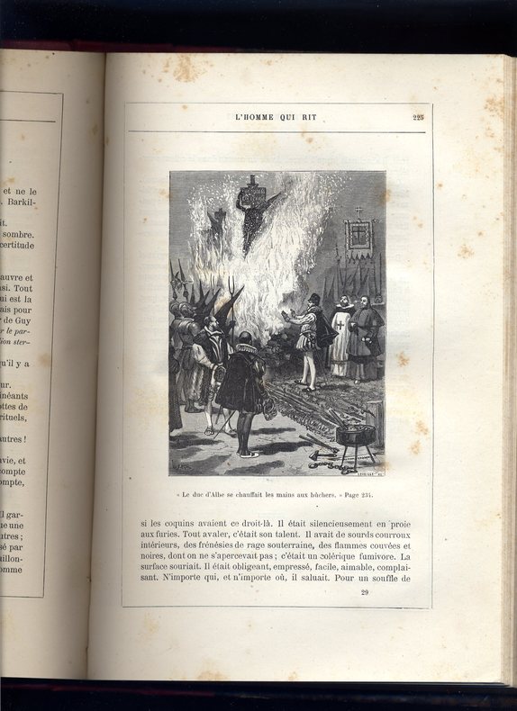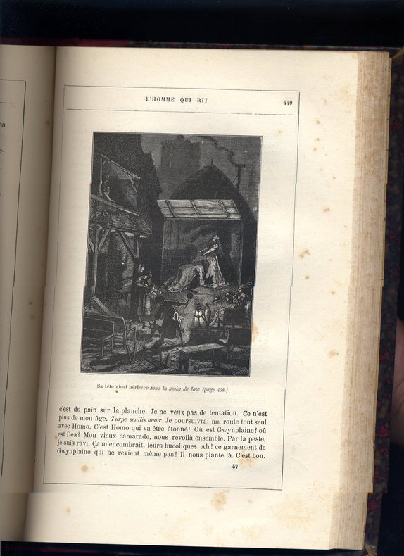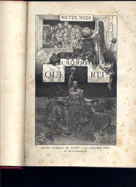 L'Homme qui rit est un roman philosophique de Victor Hugo publié en avril 1869 dont l’action se déroule dans l’Angleterre de la fin du XVIIe et du début du XVIIIe siècle. Il est notamment célèbre pour la figure mutilée dans un rire permanent de son héros qui a fortement inspiré le monde littéraire et cinématographique. ( wiki) Certainement le chef-d’œuvre de Hugo dans le domaine romanesque, baroque et sombre, où le style poétique évoluant par antithèses et oxymores est poussé jusqu'à ses extrêmes limites, et dans lequel se reconnaîtront les Surréalistes. Complet en 4 volumes in4, 250x150, reliés demi cuir, 376, 307, 380, 300pp, qq rousseurs éparses et pales auréoles sur qq pages. Paris, Lacroix, Verboeckoven & Cie, 1869. Édition Originale. ref/19