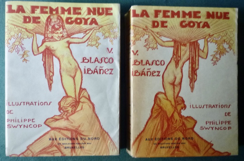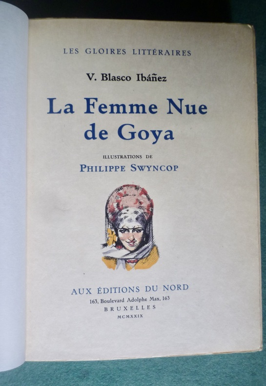 # AUTEUR: Blasco Ibanez V. # ILLUSTRATEUR: Swyncop Philippe # ÉDITEUR: Editions du Nord - Bruxelles # COLLECTION: Les gloires littéraires # ANNÉE ÉDITION: 1939 # ENVOI, BEAUX PAPIERS: Vélin pur fil Allura # COUVERTURE: 1/2 maroquin rouge à coins - dos à 5 nerfs - titre doré - date en queue # DÉTAILS: 2 volumes in 8° reliés 224pp.+ 2ff. et 223pp.+ 2ff. N° 112 des 1000 exemplaires sur Vélin pur fil. 16 illustrations en couleurs hors texte don les frontispices, nombreuses autres dans le texte. La Maja desnuda (la Maja nue), tel est le titre espagnol de ce roman et, comme on le sait, le nom d'un des tableaux les plus célèbres de Goya. Traduit par Alfred Bengoechea. # PHOTOS visibles sur www.latourinfernal.com