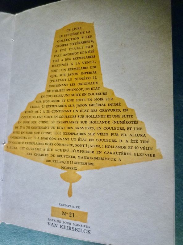 Bruxelles, Aux Editions du Nord, 1929 ; 2 volumes in-8° de 224 - (1) pp- (1)f.; 223 - (1)pp. - (2)ff. Illustré dans et hors le texte de nombreuses illustrations en couleurs de Philippe Swyncop. Reliure de demi-chagrin rouge à coins, filet doré soulignant mors et coins , dos à 5 faux-nerfs, auteur et titre dorés, tête dorée, couvertures illustrées en couleurs et dos conservés. 1 des 50 exemplaires sur Hollande contenant un état des gravures en couleurs et une suite en noir sur chine de toutes les illustrations.