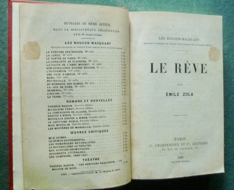 Bibliothèque Charpentier, Paris, 1888, in-18(18x11cm), couverture imprimée, 1,f.(faux-titre, 1f.(titre), 310pp., 10pp. collection Bibliothèque Charpentier, reliure percaline rouge à la Bradel, pièce de titre basane, couverture conservée (plat supérieur seulement).