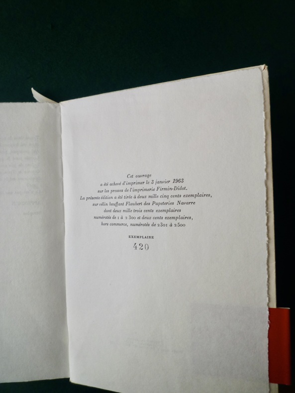 Gallimard, Paris, 3 janvier 1963, in-8 (21x14,5cm), 237pp.-1f.n.ch., broché. 1/2500 exemplaires numérotés sur vélin bouffant Flaubert Navarre (n° 420). Bande annonce conservée " La soif d'éternité". Très bel exemplaire non coupé.