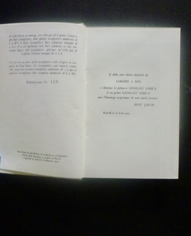Chez Delamain , Boutelleau Et Cie - Librairie Stock Paris 1922-1923 2 ouvrages reliés en 1 volumes in-16 ( 140 X 95 mm ), demi-percaline noisette à la bradel, dos lisse orné de filets et d'un fleuron dorés, pièce de titre de maroquin anthracite, couvertures conservées ( Reliure signée de Patrice GOY. Très bel exemplaire, finement relié.- JACOB Max: Le Cornet à Dés. Paris, Chez Delamain , Boutelleau et Cie - Librairie Stock, 1922. Portrait de l'auteur gravé par PICASSO EN FRONTISPICE. EDITION en partie ORIGINALE. 63 pages. Mention d'impression finale par H. Mathon à Wiesbaden ( Allemagne occupée ). - JACOB Max: Le Cornet à Dés. Paris, Chez Delamain , Boutelleau et Cie - Librairie Stock, 1923. Portrait de l'auteur gravé par PICASSO EN FRONTISPICE. EDITION en partie ORIGINALE. 136 pages.